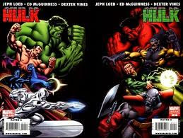 Hulk and Silver Surfer have fought a few times in non-cannon stories or as alternate incarnations of themselves. Truth be told, despite some interesting stories, these issues don't count. I see them as writers interpretations of “Hulk vs Silver Surfer” battles without continuity restraints so they always have fun twists of “What could have been.” Listed here are not all but the best of the best of the Hulk and Silver Surfer battles that occurred outside of actual Marvel continuity or cannot be listed as actual "official" fights between the two combatants.